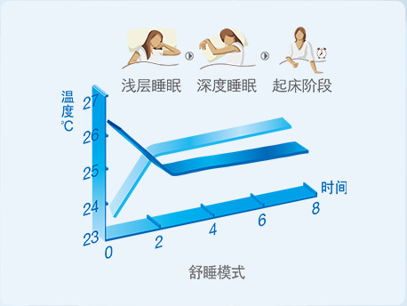 舒睡模式:貼合一般人體的體溫節(jié)律,溫度智能自動(dòng)升高(制冷時(shí))或降低(制熱時(shí)),讓您一覺(jué)睡到自然醒。 |